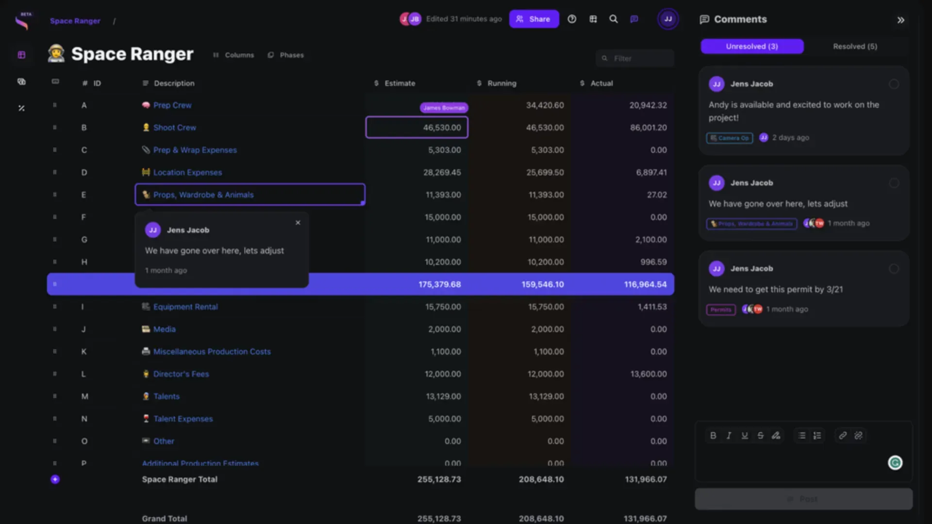 Purpose : Build, manage, compare budgets; track “actuals vs. estimate”; handle union fees, fringes, incentives