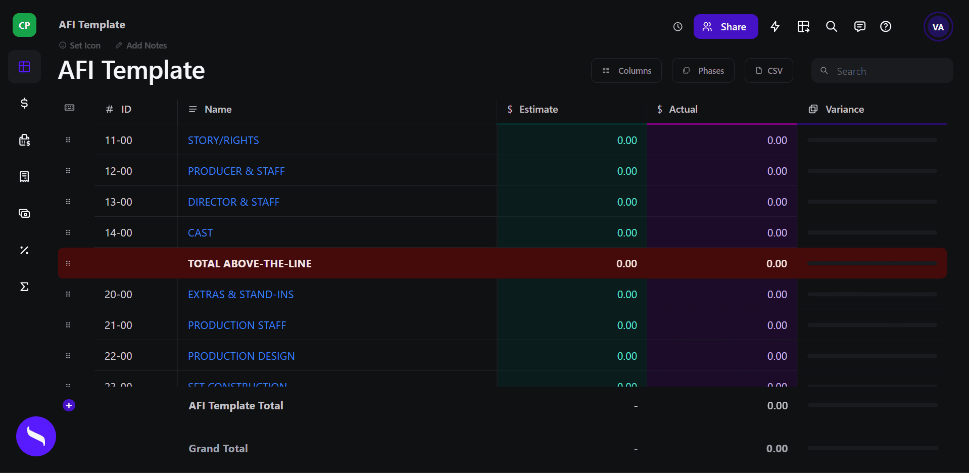 By utilizing the AFI Budget Template, filmmakers can create a robust financial framework for their projects. The template's structure encourages thorough consideration of every budget line item, from pre-production through post-production. This level of detail supports informed decision-making and contributes to the overall financial health of the production: